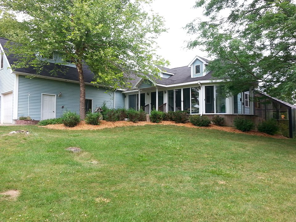 This home has it all location, park like setting and spacious floor plan. Three bedrooms, three baths, lower level walkout with potential fourth bedroom, bathroom, large family room, gas fireplace and wet bar for entertaining. Two story Solarium provides unobstructed view of the 7.93 acres and spring fed 3.5 acre pond. Pond is 20 ft deep and ready for your fishing pole. Exterior boasts natural stone landscaping and brick walk way and patio. Newer furnace, water heater and well pump/tank/adapter. Zoned residential but can be used for professional office if desired. Truly a must see!