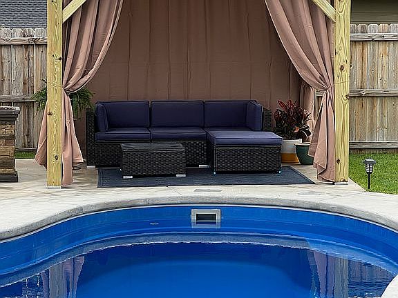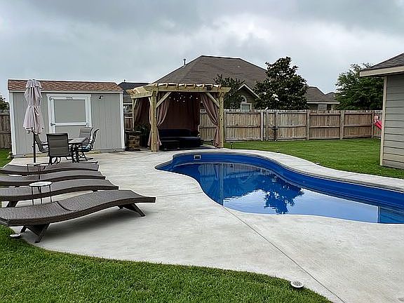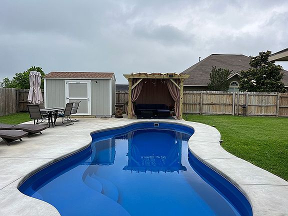Beautiful 4 bedroom 2.5 baths, two-story home in the Stoneridge neighbor of Navasota. 17 minutes to William D. Fitch. Walk through the front door to beautiful raised ceilings in the bright and open living room with vinyl plank flooring. The living and kitchen have an open concept floor plan with the kitchen providing stainless steel appliances, granite countertops, ample cabinets and pantry space. Master bedroom is downstairs. Master bath has granite countertops with double sinks, separate tub and shower, and large walk-in closet Go upstairs to a well thought out floor plan with 3 bedrooms, 1 bath, game room, and study area. New roof as of late 2017. 12x32 In ground salt water pool installed 2021, patio extension back yard to 12x2 with roof over, 8x12 shed built on back property, 8x10 Gazebo built on back property. large cement patio surrounding pool installed. 2023 added 24kw whole house Generac generator
