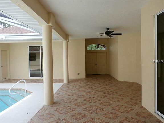 This custom designed home invites you through the front foyer which opens to a unique courtyard and pool area. Walking through the courtyard brings you to double doors that open to a spacious great room with stack trey ceilings, indirect lighting and fan, beautiful tile flooring and granite window sills, and has an adjoining den/office or 4th bedroom. The kitchen highlights include granite countertops, wood cabinets, stainless steel appliances, recessed lights and a breakfast nook with sliders to the pool/courtyard. The master suite has tile flooring, a trey ceiling, a generous walk-in closet, and access to the lanai/pool through glass sliders. The private bath has a soaking tub, separate step-in shower, built in display shelf, and a double sink vanity with a granite countertop. Across the courtyard is a private 3rd bedroom/guest suite that has its own bath. The large screened in courtyard is accessible from great room, breakfast nook and the guest suite and has an exit to the yard. A large inside laundry room, hurricane shutters, a manabloc overhead plumbing system, and irrigation system are only some of the extras that are included in this house.