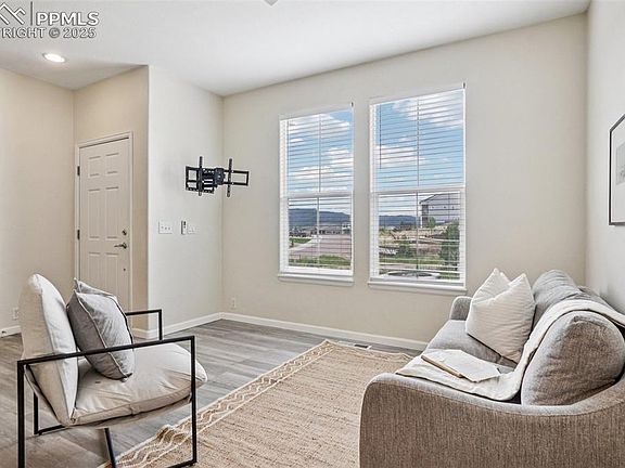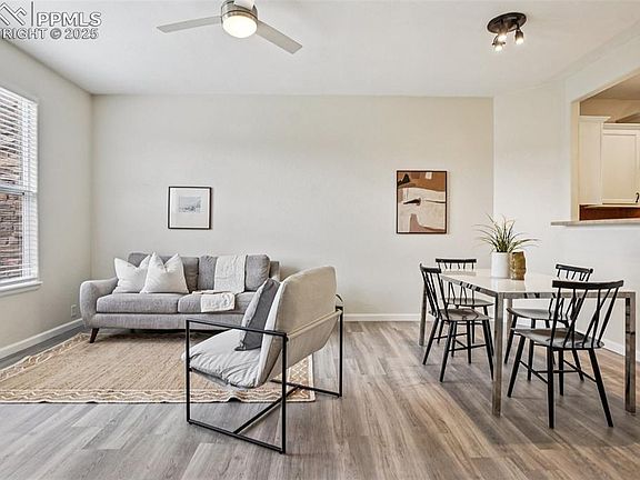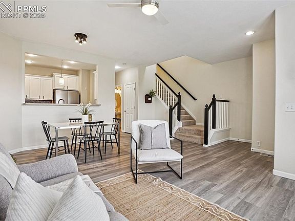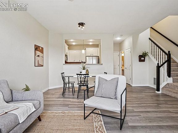 Welcome to this charming home with stunning mountain views and fresh updates throughout! Step inside to find vaulted ceilings and brand-new laminate flooring that flows across the entire main level. The open-concept layout features a bright living area and a cozy dining area. The kitchen has been refreshed with painted cabinets, a new sink, and updated lighting, creating a clean and inviting space. Don’t miss the deep pantry right off the kitchen. Stainless and black appliances complement the kitchen. For those warm days, the Lennox air-conditioner will cool things off nicely. The spacious primary suite features a double vanity, walk-in closet, and an abundance of natural light. The laundry room is conveniently located on the upper level and includes the washer and dryer. The water heater was newly installed in March of 2025. Enjoy easy access to nearby walking and riding trails. Community also features its own grassy dog park. With I-25, shopping, and dining just minutes away. Come take a look!