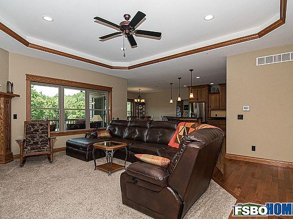 Call (563) 580-4584 today!! Buyers agent welcome. Don't miss your chance to own this stunning, spacious, custom-built 5 BR, 3.5 BA ranch resting amidst a beautiful 5.5+ acre country setting only minutes from town. This warm and inviting open-concept home features a main level with gorgeous hardwood floors and an office/study that could easily be used as a formal dining room. The living room with lighted tray ceiling features a handsome hand-crafted fireplace and a wall of windows overlooking nature and the enormous yard. Also impressive is the well-designed kitchen with custom cabinetry, tile floors, granite counter tops, stainless steel appliances including a gas stove, a breakfast bar, and a large pantry. The sizable dining area is also lined with windows and flooded with warm light. For your convenience, the appliances stay with the home. The split-bedroom design of this home includes a large first floor master bedroom suite, 2 bedrooms with a full bath between them, as well as a guest half bath and 1st floor laundry. The master bedroom features another lovely tray ceiling, sitting area, and walk-in closet. The master bath has tile floors, solid surface counters, double vanity, jetted tub, and tile shower. In-floor heat throughout the lower level, master bath and garage. The finished walkout lower level starts with a partially open staircase leading to an impressive abundance of additional living space, including a large recreation/family room with a second custom-built fireplace and a sliding door to the patio. Guests, family and friends can live or visit in comfort in the 2 lower level bedrooms with daylight windows and adjacent full bath. There is convenient garage access from the rec room area, a terrific workshop, and ample storage space. Outside is just as impressive with its roomy upper composite deck with stairs down to a magnificent lower stone patio complete with exquisite night lighting and built-in fire pit. Whether inside or outside, one can live comfortably and relax and/or entertain in style while overlooking the beautiful views all around you. Come see this home in person to fully appreciate all of the quality and special features this home has to offer. Please call (563) 580-4584 today to schedule a private showing