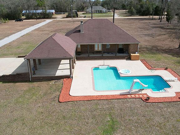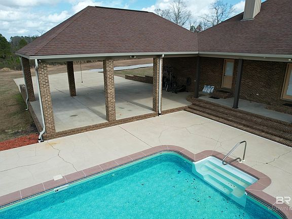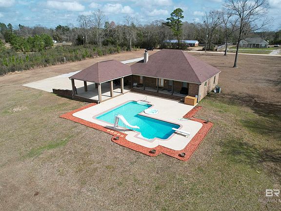 This home offers over 2300 square feet of living space, featuring an open concept design, a cathedral ceiling, and a wood burning fireplace in the great room. The large French doors in the great room open up to the back porch, where you can enjoy the fresh air and the scenic views of the rolling hills and woods. A few steps lead you down to the pool area, where you can swim, relax, or entertain in style. The master bedroom is a true retreat, with two walk-in closets, a garden tub, and a separate shower. The backyard is an entertainer’s dream, with a large in-ground salt water pool, a heated whirlpool sauna, and a covered patio. The kitchen is a chef’s dream, with an open concept design that overlooks the great room and dining room area. The kitchen features a double oven, a smooth surface stove top, plenty of cabinets and counter space, and a large walk-in pantry. Whether you are cooking for yourself or hosting a dinner party, you will love this kitchen. The laundry room is conveniently located and has a central vac system. The washer, dryer, and other appliances will remain with the home, making your move-in easier. The home also has plenty of storage space throughout. The high ceilinged three-car carport provides ample parking space and protection from the weather. Don’t miss this opportunity to own your dream home in rural North Mobile County minutes from Mobile. All updates per seller. All measurements are approximate and not guaranteed, buyer to verify.