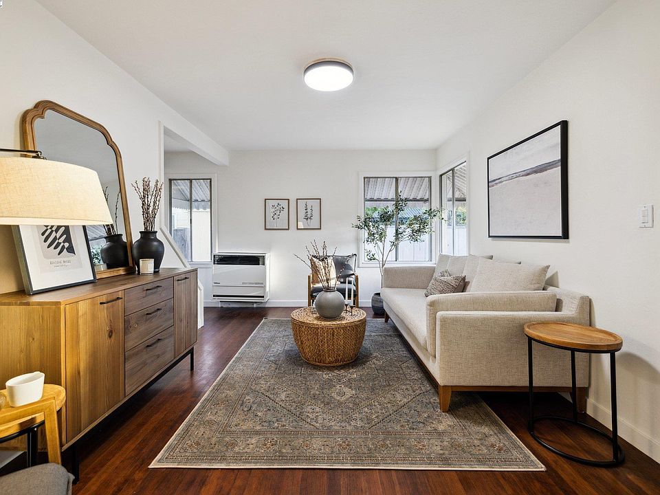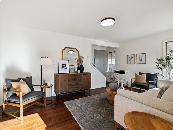 This charming 2-story townhouse style home in Alameda's historic Woodstock Co-op is refreshed & move-in ready! Located in Alameda's vibrant West End & situated on a large lot, this light-filled home features 3BR, 1BA, 900 SF of living space, a family/living room, plus an eat-in kitchen that overlooks a spacious backyard. Beginning in 1940, these historic bungalows were constructed to house the men and women at Alameda Bethlehem Shipyard who built & refurbished Navy ships used during WWII. Recent improvements include a newly refreshed kitchen & bathroom, refinished vintage hardwood floors, new light fixtures, fresh interior paint, new refrigerator & stove, new G.E. all-in-one washer/dryer, refreshed landscaping & a new redwood fence for privacy. Plus community EV charging stations located just across the street! The sunny backyard is perfect for entertaining, relaxing or playing. Permit parking for two vehicles is available in the front & rear of the property. Close to downtown Webster Street's many amenities, Alameda Point's Saltbreaker Restaurant & Firebrand Bread Co., Faction Brewery, Almanac Brewery, Humble Sea Brewing, Dashe Cellars & Urban Legend wineries, & Alameda Landing shopping, with easy access to the SF/Jack London Square ferries, Posey/Webster Tube, BART & freeways.