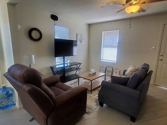 Beautifully remodeled Tiny Home ready for you to move into. Easy care wood look tile throughout except bedrooms. New Refrigerated AC, New Bathroom, New Kitchen with all new appliances: Refrigerator, Microwave, Gas Stove, and Water Softener. Laundry room with new washer & new dryer in the storage room. It's 1 block from a large grassy park and tennis courts. Close to shopping, medical offices and other city amenities.
