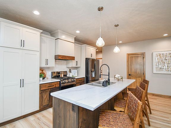 Welcome to this stunning single-family slab-on-grade home, where modern comfort meets thoughtful design. Featuring 3 spacious bedrooms & 2 luxurious bathrooms, this home is perfect for those seeking both style & convenience. Step inside to an open floor plan, highlighted by elegant tray ceilings that add a touch of sophistication. The heart of the home is the kitchen, a chef's dream come true, boasting a gas stove, a large island perfect for meal prep, casual dining, & an expansive pantry complete with rollouts for easy access/organization. Relax in comfort with heated floors in both bathrooms, adding a touch of luxury to your daily routine. The 3-stall finished garage is painted and offers ample space for vehicles & storage & it's thoughtfully plumbed for future heating, with insulation in the ceiling to ensure energy efficiency. Additional features include toggle switches throughout and real natural stone to the front of the home. Located in a convenient area with easy access to the interstates & the airport, this home offers the perfect blend of convenience & tranquility. Sod/sprinkler included.
