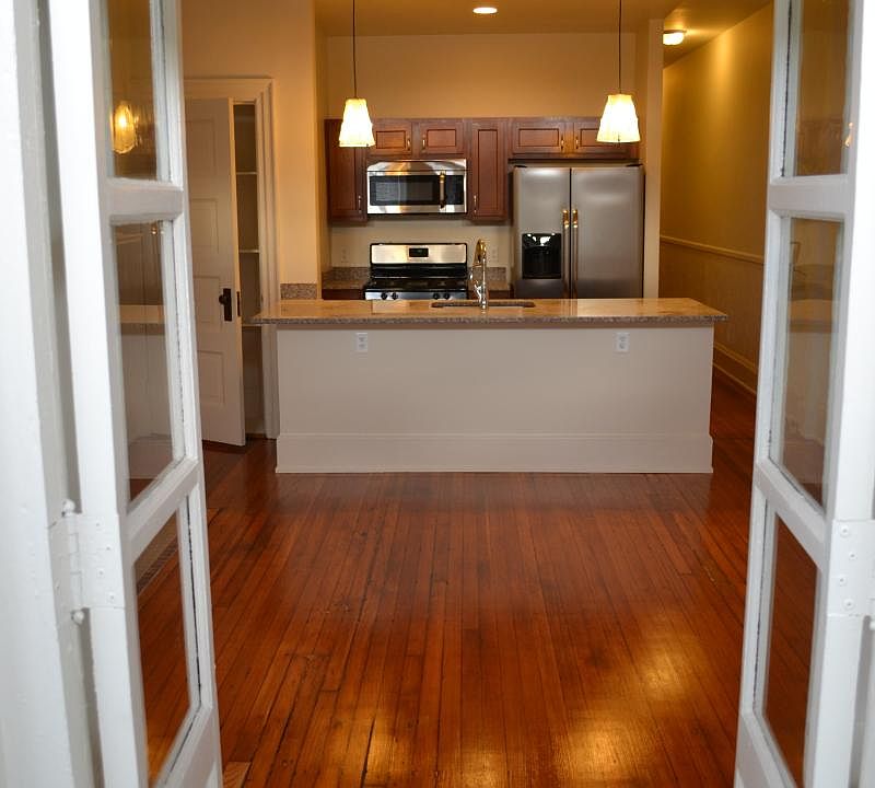 Up for rent is a beautiful apartment that has a brand new kitchen with stainless steel appliances (side by side refrigerator with ice maker and water dispenser, gas range, microwave, dishwasher), garbage disposal, granite countertops, ceramic floors, and new cabinets with an island with an overhang. The original parquet wood floors throughout have just been refinished and everything has been repainted. Still has many moldings, fireplace in family room and bedroom, curved ceilings, curved walls, stained glass and a lot of charm while still having newer technology like central air and audio/video intercom system. Also has another room off of the family room. Washer and dryer in building. Close to MICA, University of Baltimore. One other unit in building available. Owner Pays for water. Tenant is responsible for Gas & Electric.