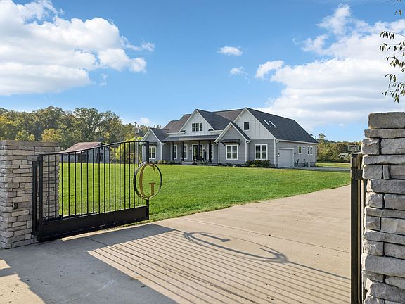 KICK OUT CLAUSE- PLEASE CONTINUE TO SHOW. ACCEPTING OFFERS. Adding 1,728 sq ft of finished space, the detached guesthouse makes this property truly exceptional. Welcome to this beautifully crafted estate set on 5 acres of manicured grounds with a gated entrance for added privacy. Designed with comfort and functionality in mind, the home offers mainly one-level living, paired with versatile spaces indoors and out. A charming front porch sets the tone, inviting you into the open-concept main home where natural light, warm wood beams, and thoughtful details abound. The spacious living room boasts a vaulted ceiling with a striking shiplap fireplace and custom ceiling accents, creating a true focal point. The chef’s kitchen is equally impressive, featuring a large center island, ceiling-height cabinetry, built-in double ovens, a gas cooktop, stylish open shelving with shiplap accents, and even a hidden doorway for added character. The primary suite offers a private retreat with its vaulted shiplap ceiling, spa-inspired bath with double vanities, a floor-to-ceiling tile shower, and a generous walk-in closet. Three additional bedrooms and two full baths complete the main home. The detached guesthouse provides exceptional flexibility, perfect for multi-generational living or private guest quarters. It includes a living room, full kitchen, bedroom, full bath, half bath, and a spacious bonus area adaptable to your lifestyle—whether it’s a home gym, billiards room, rec space, art studio, office, or workshop. Outdoor living is just as inviting, with a covered back porch and patio ideal for taking in the serene setting. With plenty of room for a future pool and endless possibilities across the property, this estate offers both beauty and potential. An incredible opportunity to enjoy the best of country living with convenience and versatility built in.