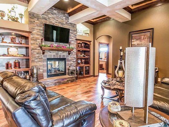 This Exquisite One Level Delight Demonstrates The Finest Craftsmanship & Design. Built w/high quality finishes incldng in-floor heat for all 2,939 MF sqft. You'll love the chef ktchn w/cstm cab, high-end app.pckge, 8ft islnd, brkfst bar, granite cntr tops, hnd-scraped walnut flrs & crwn mlding.The dnng rm opens to living rm w/coffered ceiling, crwn molding, flr to ceiling stone-encased FP, built-ins & 4-season rm w/another FP, vaulted ceilings & access to the patio.The mstr bdrm ste holds another FP, crwn molding in tray ceiling & spa like mstr bth w/dble vanities & giant W/I tile shwr.The lndry rm includes granite cntrs, sink, tile backsplash & tons of cabinets. Awesome 4th bdrm w/more crwn molding & builtins, including a hidden door, which opens to a concrete storm shelter.The 4 stall garage is complete w/epoxy floor, water, drains & srrnd snd. The massive patio, highlighting a built-in FP & oodles of privacy. Security & sound sys & more-nothing is spared in this gorgeous 1 lvl home.