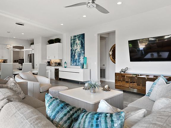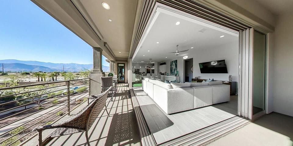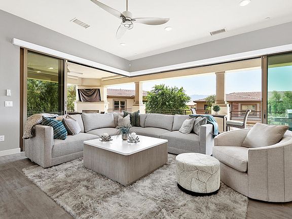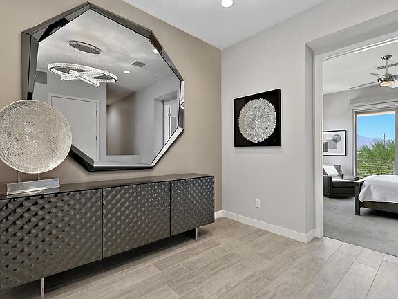 This stylish contemporary stunner has it all to perfection, with a gorgeous interior design, that looks brand new and shows much better in person than the photos. There's a large open airy great room and a perfectly designed floor plan. There are mountain views from its single level upper setting with an interior elevator for convenient access. Towering sliding glass doors that open to a spacious covered patio with fireplace and flatscreen TV. It's a perfect gathering place for entertaining or cozy relaxation. The gourmet kitchen has Bosch appliances with a 10 ft Long Island and bar seating for four. Plus, there's a large walk-in pantry. It's all offered ''Turn Key'' with 'like-new' furnishings, cutlery, dishware, fully outfitted bathrooms - The works! (Many items are brand new - per written inventory.) The Primary bedroom is exquisite with a huge walk-in closet and many built-ins. Its bathroom is spacious with a huge shower, separate tub and its all light and airy. The guest suites are spacious with walk in closets TVs, and gorgeous bedding. One is an en suite with a bathroom boasting twin sinks and a huge balcony. There's a large laundry room with a sink. The garage has AC plus a coated floor. There are electric blinds, electric exterior sunscreens and electric roll-up metal security panels. This is one impressive 'must-see' property that is far prettier in person. The Seller will consider carrying paper for a short-term bridge loan or a Lease with purchase option.