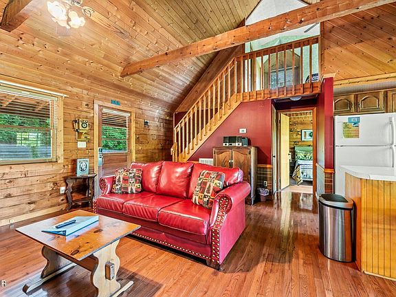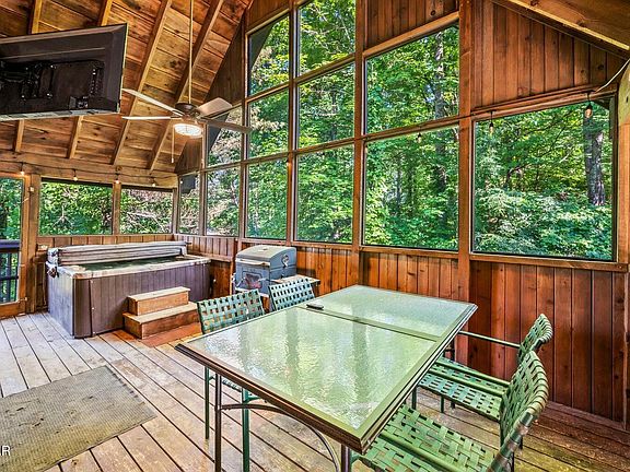 Escape to the serenity of the Smoky Mountains with this charming, true log cabin tucked away in Hidden Mountain West—a desirable location with no HOA and no management restrictions. Set in a peaceful, wooded setting, this two-bedroom, two-bathroom retreat is ideal for nature lovers and those craving a relaxing mountain escape. Inside, original hardwood floors and a striking stone fireplace add warmth and rustic character. The main-level suite offers a king-sized bed and private en-suite bath, while the spacious upstairs loft functions as a second bedroom—also with a king bed and its own full bathroom. Step outside to the large screened-in porch, complete with a hot tub and a mounted TV—perfect for movie nights in the fresh mountain air. Additional outdoor living spaces include a covered front porch and a back deck, both ideal for unwinding and taking in the tranquil forest views.