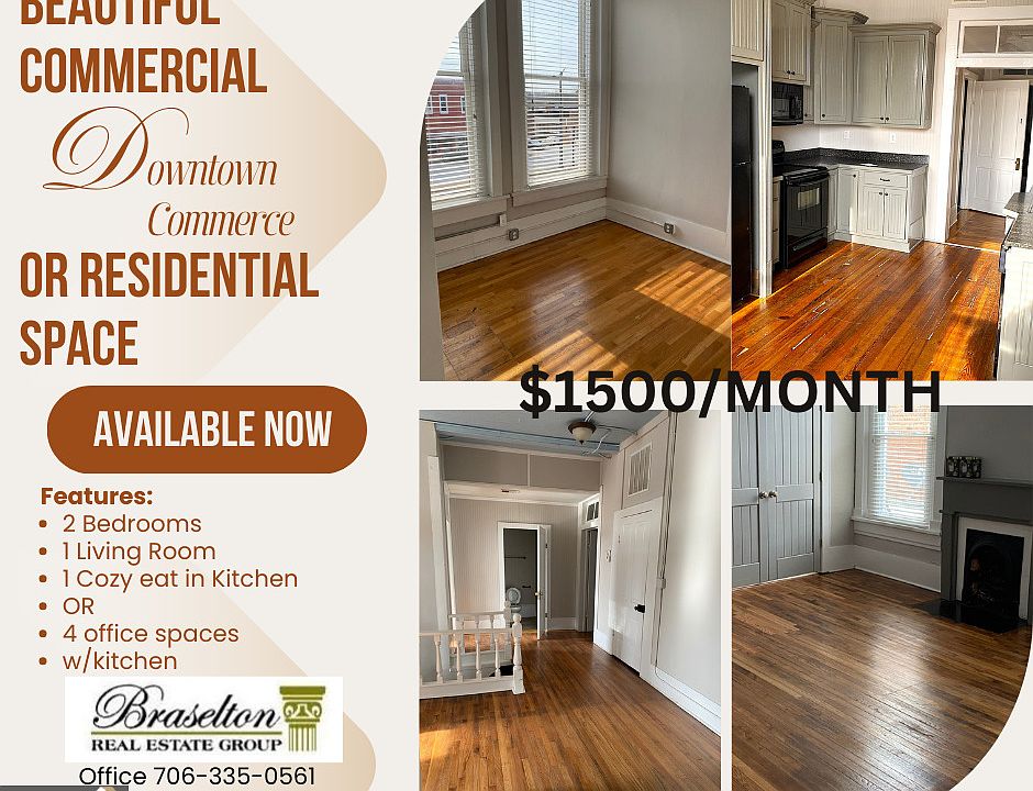 The apartment above our office is stunning! In the heart of downtown Commerce, this 1800 building still has a great deal of its charm from long ago!! We are renting this as a residential or commercial space. This could be a great commercial office space that could be up to 4 offices with a kitchen or an amazing apartment that is 2 bedrooms/1 bath/spacious living room/eat in kitchen w/ a dining space or home office overlooking downtown. This beautiful apartment above our office is a must see!! Literally just a few steps away, you can get your coffee and donuts from Diesel Donuts Commerce, enjoy a margarita and some yummy Mexican cuisine from El Parian Downtown Commerce, hang out and sing karaoke on Friday nights at the Commerce Sports Bar and Grill, or just hang out and eat a great burger and wings at Friends Commerce Grill. This building is agent owned. Copyright Georgia MLS. All rights reserved. Information is deemed reliable but not guaranteed.