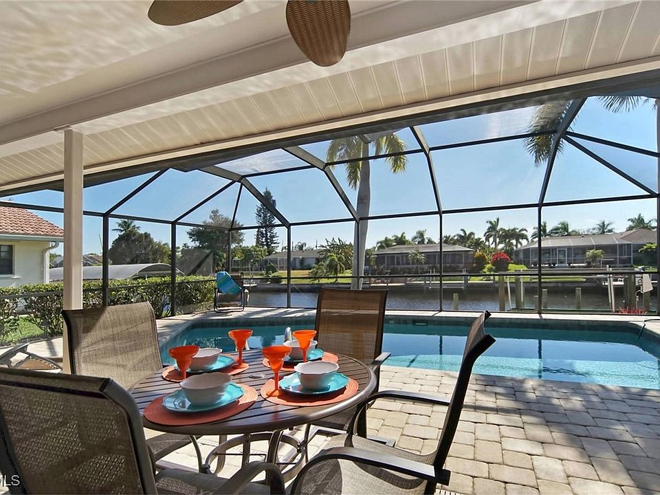 This is a VACATION RENTAL. Owner will not consider an annual rental. Weekly rentals permitted. Villa Connie is a spacious 3-bedroom, 2-bath home with a split floor plan for privacy. Located on a sailboat access canal just a short trip to the Caloosahatchee River and onto the beach of Mexico's beautiful waters, this villa offers everything needed for a memorable Florida vacation (the boat lift is not available for tenant use). The large living room features comfortable leather furniture, a large flat-screen TV, and a beautiful view of the pool from the sliding glass doors. Villa Connie is complete with a game room with a pool table, dartboard, large screen TV, and a dry bar.