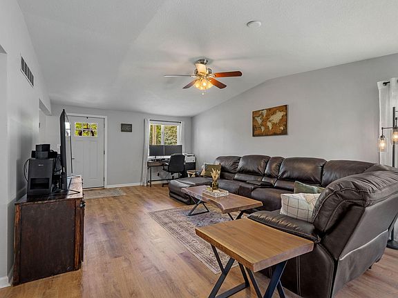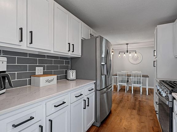 This epitome of turn-key perfection is a fully remodeled rambler on over half an acre, a personal woodland and no neighbors on 3 sides. The spacious primary suite boasts a massive walk-in closet and luxurious bathroom. The main floor features a full bath, open floor plan, vaulted ceilings, and a dedicated dining area. The kitchen is adorned with stone countertops, tile backsplash, and stainless steel appliances. The lower level offers 2 more bedrooms, a family room, ample storage, a lavish full bath, and a convenient laundry area. Enjoy the new deck with custom railing for outdoor entertaining. Additional features include a 2-car garage, concrete driveway, new shed and professional landscaping. This property truly embodies the perfect blend of comfort, style, and functionality.