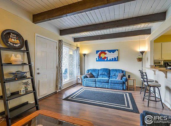 Cute & inviting 2 bedroom, 1 1/2 bath 2-story end unit townhome w/fenced backyard. This light & bright home with open floorplan boasts new paint & some flooring. The main level features living room w/ exposed beams, kitchen with numerous cabinets & breakfast bar, laundry & 1/2 bath. Upstairs you will find a full bath, 2 spacious bedrooms including master w/a private covered deck. All appliances & attached storage shed included. Close to community pool, CSU, bus route & Horsetooth Reservoir.