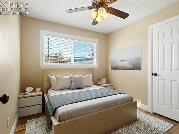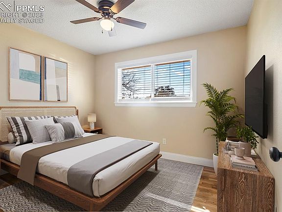 Great starter home or for those looking to downsize, this home has mountain views and has been recently upgraded. Imagine the holidays gathering in your kitchen with all new stainless steel appliances, new hardware and gorgeous granite countertops! All 3 bedrooms and living room have ceiling fans to supplement the Central Air in the summer and there are so many updates including newly refinished hardwood floors throughout, newer roof 2021, electric tankless on-demand water heater, new vinyl blinds in all rooms, new insulation, new fresh paint inside and out and vapor barrier in the crawl space - all done this year! The bathroom features beautiful custom tile shower surround and there is plenty of storage to be found in the 1 car garage with rafters and shelves. Situated in a quiet neighborhood with schools, shopping and Fort Carson within minutes, this home is just waiting for a new owner to make it their own!