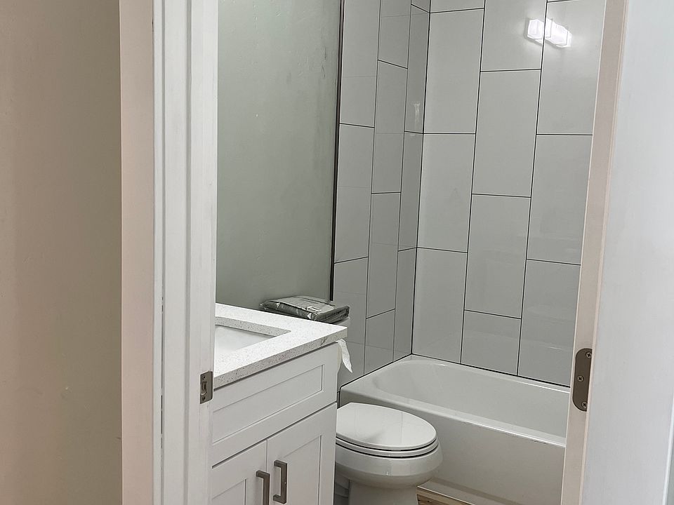 Primary bathroom has double vanity with zero entry walk in shower. Both bathrooms have floor to ceiling tile with brushed nickel fixtures.
