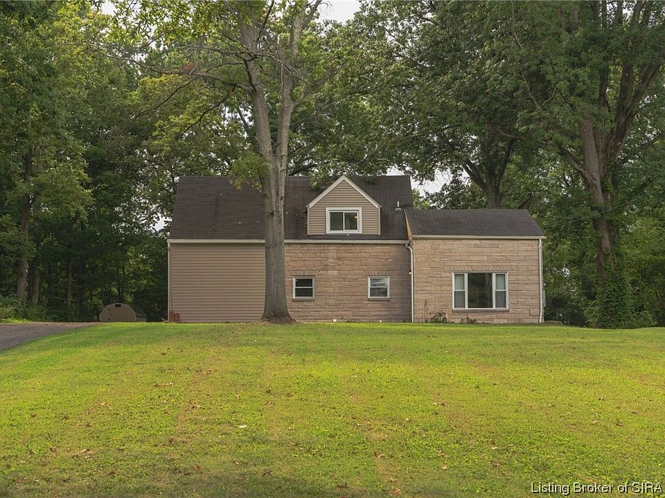 Rare find! 0.71 acre lot in the heart of New Albany. Close to downtown but also convenient to Charlestown Rd./Grantline Rd./State St business corridor. The large lot has beautiful, mature trees and is across from New Albany golf course. This charming, stone finished home has large rooms throughout including a spacious kitchen. The first floor bathroom with garden tub and stand up shower connects to the main bedroom. The second floor has 2 additional bedrooms with their own bath. HVAC was replaced in 2019. The outdoor space includes a detached, 2 car garage and storage shed. All inspections welcome, seller is selling as is. Be sure to schedule your showing today!