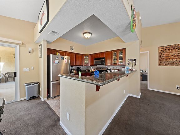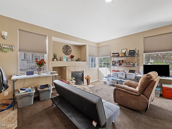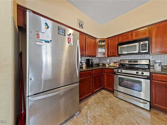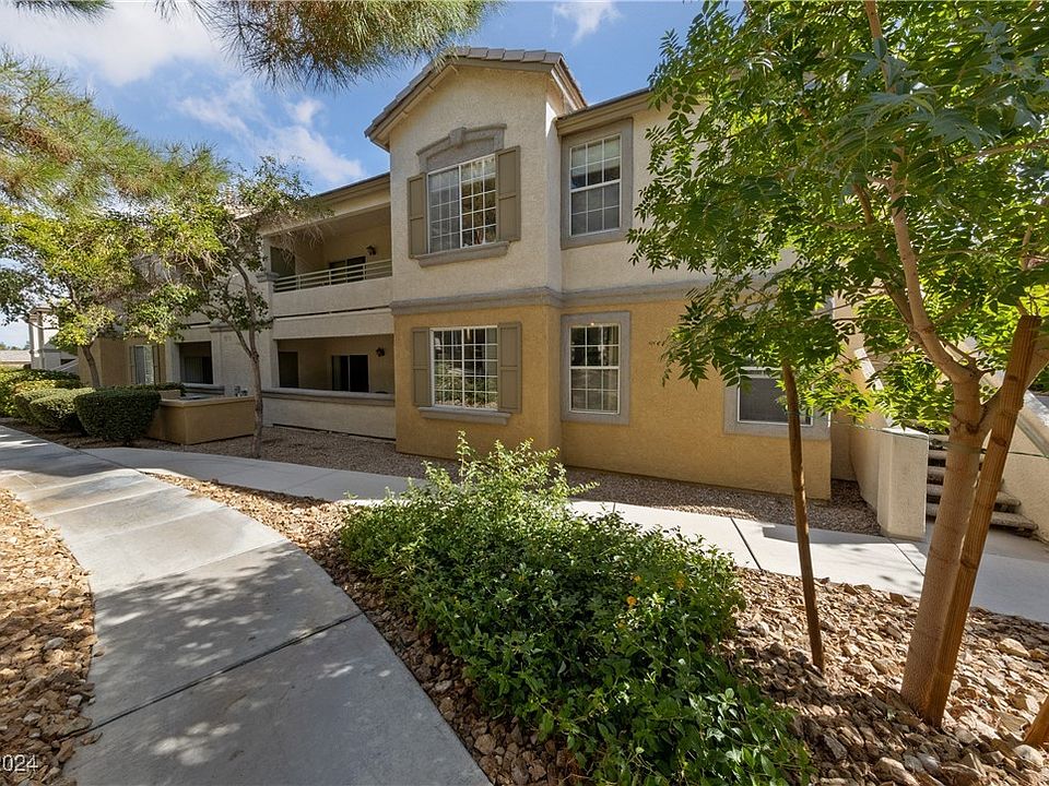 Welcome to this wonderful 3 bedroom 2 bath second floor condo in the gated Summerlin community. The condo comes nicely finished with stainless steel appliances, granite countertops, and breakfast bar. Featuring fireplace, laundry room, and large balcony overlooking a lush green space. The primary bedroom includes a walk-in closet, private access to balcony, and bathroom with a separate shower and tub. Detached garage and assigned covered carport. Enjoy community amenities including community pool and spa. Excellent location with close proximity to shopping, dining, parks, TPC, and Summerlin Hospital.