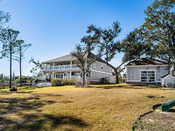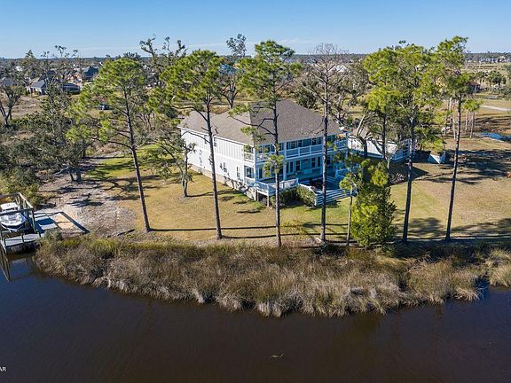 Currently under contract with contingency. Seller is accepting backup offers. Occupying a site of over one acre, this newly constructed waterfront home is on North Bay in Lynn Haven. Seven bedrooms, two living areas and an expansive rear deck provide space for every activity, from dining and entertaining to relaxing, boating, or nature-spotting. The covered front porch provides an attractive entrance through a glazed front door and once inside, the full scale of this sizable home becomes apparent. Vaulted ceilings and mezzanine balconies create a lofty double-height sitting area with feature shiplap fireplace and wood tile flooring. Throw open the French doors to enjoy unspoiled waterfront views and let the living area spill seamlessly onto the covered porch.