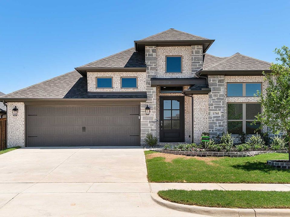 Extended entry with 12-foot coffered ceiling leads past formal dining room to open family room, kitchen and morning area. Family room features a wood mantel fireplace and wall of windows. Kitchen features generous island with built-in seating space and 5-burner gas cooktop. Primary suite includes double-entry to primary bath with dual vanities, garden tub, separate glass-enclosed shower and large walk-in closet. All secondary bedrooms feature walk-in closets. Extended covered backyard patio. Two-car garage.