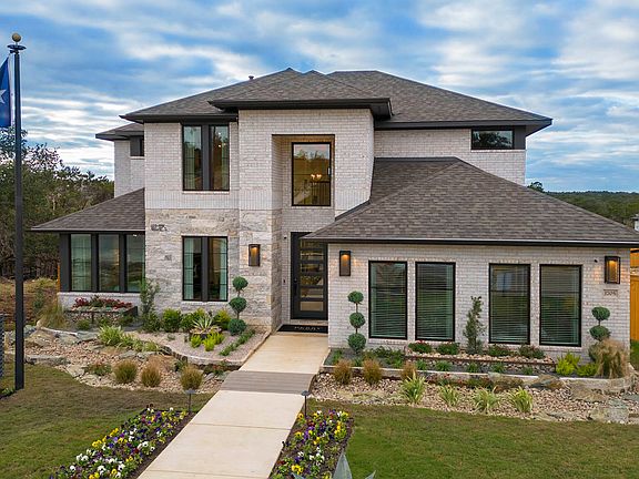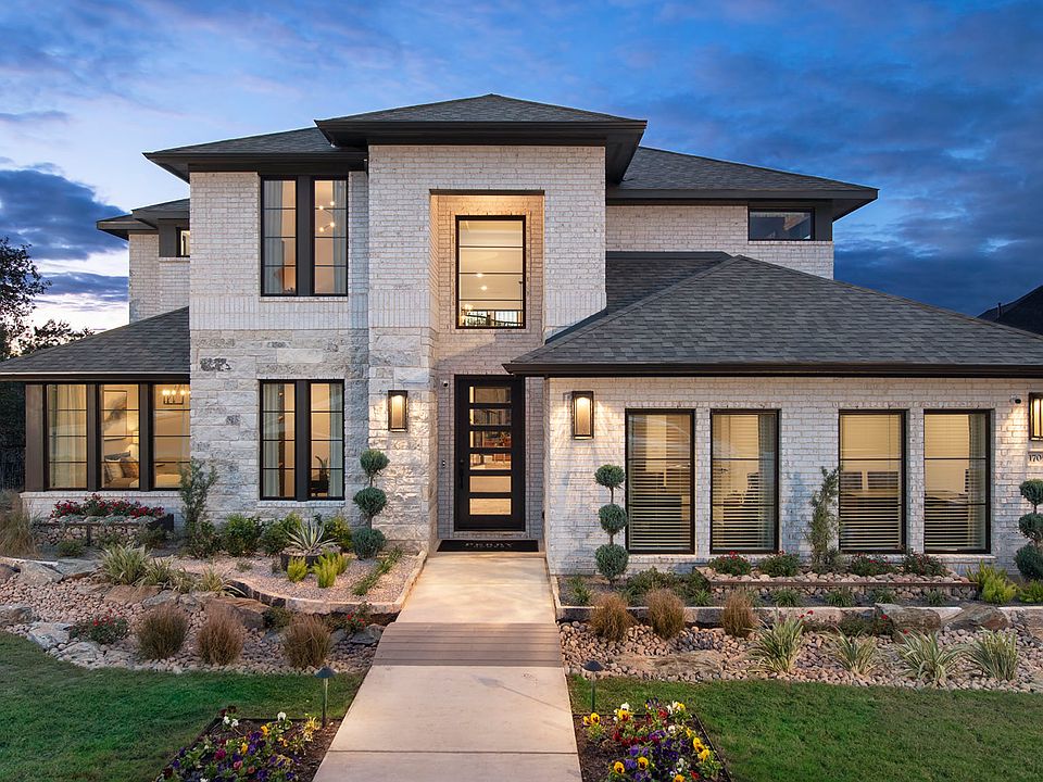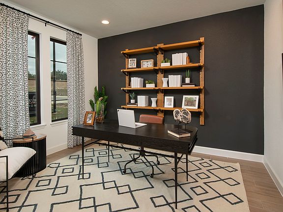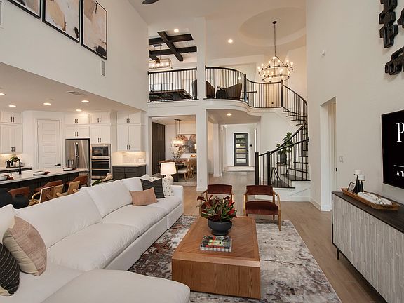 Former Model Home. Home office with French doors set at two-story entry. Formal dining room opens to curved staircase. Kitchen and morning area open to two-story family room. Kitchen features generous island with built-in seating space and 5-burner gas cooktop. Family room features a sliding glass door. Primary bedroom features 12-foot ceiling. Primary bath includes dual vanity, freestanding tub, separate glass-enclosed shower and oversized walk-in closet with access to utility room. A second bedroom is downstairs. A game room, media room and secondary bedrooms are upstairs. Representative Images. Features and specifications may vary by community.