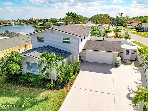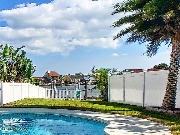 PRETTY 4-Bed/2.5-Bath/2-Garage DEEP-WATER CANAL & POOL HOME is TOTALLY RENOVATED with HIGH-QUALITY WORKMANSHIP throughout. CUSTOM Kitchen Cabinetry with Coffee station, Pull-out shelves, Granite tops, Gas Stove, & huge Breakfast bar. Downstairs Split living areas, Guest bath, laundry, Private Poolside Lanai, & fenced-in backyard with Fire pit. 4/2 upstairs with Hard-wood flooring & big Balcony/Deck (26'x11') with lovely Sunrises & Sunsets. SECURE with NEW HURRICANE-RATED Windows, Doors, Roof, & FULL-HOME GENERATOR. BOAT LIFT with Easy Access to Banana River (or Intracoastal Waterway or Ocean) without impeding bridges!! Extra RV Parking & Storage Shed. Secluded Pelican Creek Estates is Peaceful & Safe yet Central to all Shopping, Restaurants, Hospitals, KSC, Port, Beaches, etc.