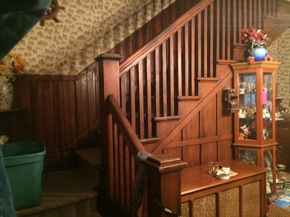 New high efficiency furnace 2 yrs ago. 2 car detached Garage. Privacy fence large side yard. Has master bedroom downstairs and 4 bedrooms upstairs. Has another room downstairs that could be used for office, TV room or 6th bedroom.Front porch. Basement. House will be sold as is. Lots of original character woodwork. 2 bathrooms. House in need of drywall work and has original wiring and plumbing. House will be sold as is with no warranty.