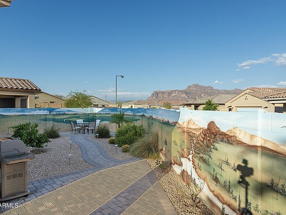 Enjoy the Superstition Mountain VIEWS from this back patio!! This home is in the 55+ Community of Bel Agave, which is a gated neighborhood with amenities that include a Pickleball court, Large Swimming Pool, Exercise room, pool table, huge kitchen with sitting gathering areas, putting green, dog park and more to enjoy! This well built 2018 Kauffman Home has a comfortable floorpan with a large wrap around extended paver patio to sit out and soak in the VIEWS. This home is a corner lot with features that include 9' ceilings, quartz kitchen counters, large floor tile, large walk in tiled master shower, tiled shower walls in hall bathroom, RO water in kitchen, whole house water softener, removable sun screens, fully insulated garage, artist painted block walls around back patio, and more!!