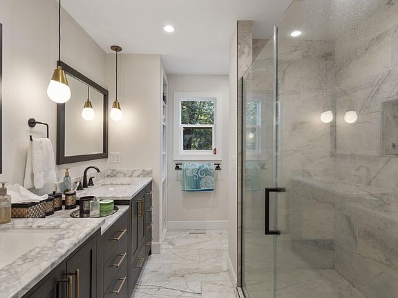 Finished lower levelNew fenceSurrounded by treesStone fireplaceWooded backyardWood beamLarge back deck