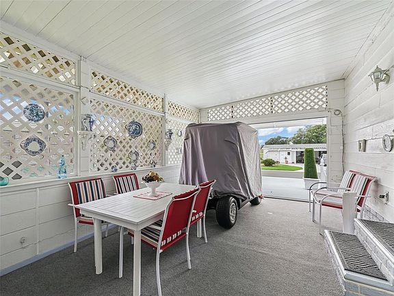 This 2-bedroom, 2-bathroom manufactured home is in the Village of Orange Blossom. The kitchen is fully equipped. The living room includes a seating area and a Smart TV. The master bedroom has a king bed, Smart TV, and an ensuite bathroom with double sinks, a walk-in shower, and a separate toilet area. The guest bedroom has a queen bed and is near a bathroom with a tub/shower combo and linen closet. Outdoor features include an enclosed lanai and a screened lanai with a motorized screen door. A new golf cart is included. Located under 5 minutes from Spanish Springs, Orange Blossom Golf & Country Club, Paradise Family Pool & Rec Center, Hilltop Adult Pool, restaurants, and shopping. July-October monthly $2250 plus taxes & Fees-November $2175 plus taxes & fees--December $2550 plus taxes & Fees-- PLEASE CALL FOR PEAK SEASON(JAN-MAR) & WEEKLY RATES