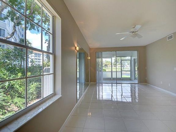 Premium location with great view of the golf course, SW exposure invites sunlight & fills the open floor plan home with light. In demand 1st floor end unit with extra windows. Two bedrooms PLUS separate den (can be easily converted to 3rd bedroom), tiled throughout-new carpet in primary bedroom. Eat in kitchen offers white cabinetry, Cambria quartz counters, marble backsplash, under cabinet lights, large primary bedroom w/2 closets, screened patio w/gorgeous views of the golf course, pond & fountain. Full size washer/dryer in laundry room, 1 car garage w/hurricane impact door. This is a wonderful all ages community, pet friendly (no size limit). Residents can enjoy golf & tennis w/no membership. Manned security entry gate. Great location-close to I95, shops, restaurants, downtown, beaches
