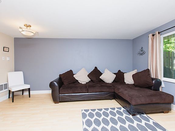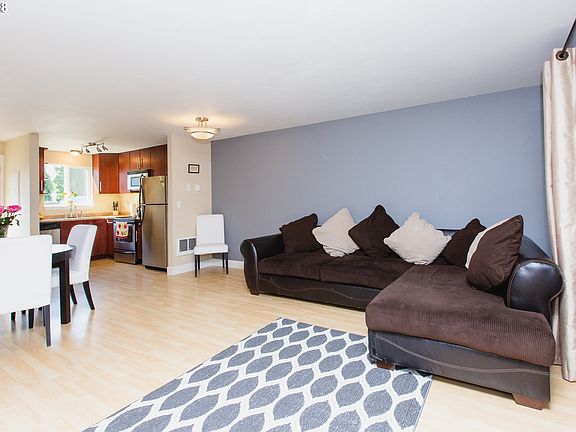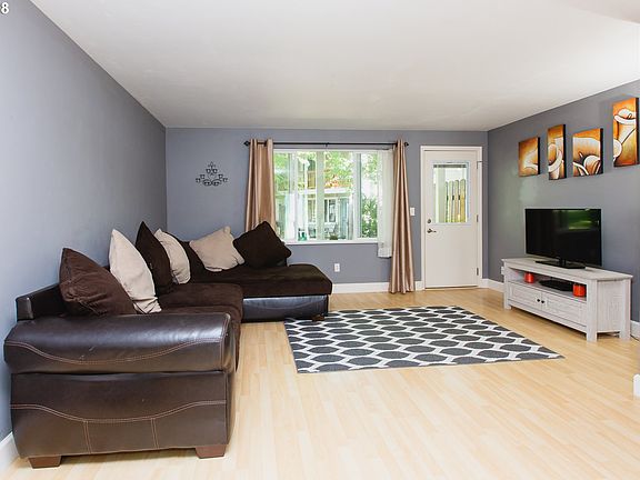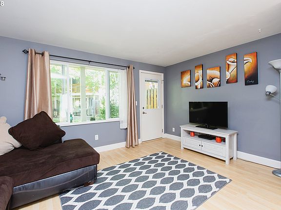 Stylish & affordable condo remodeled in 2007. Ground floor w/ open living, kitchen & 1/2 bath. S. facing kitchen window & covered living room patio. Kitchen w/ range, fridge, DW, micro & disposal. Laminate floor on main. 2 bedrooms & 1 full bath up. S. bedroom w/ Mt. Hood view & clever in-closet laundry. N. bedroom w/ treehouse deck. $178/mo. HOA covers water, sewer, garbage, exterior maintenance & insurance, landscaping & snow removal.