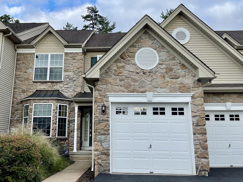 Stunning condominium located in the Premiere Golf Course Community-Country Club of the Poconos. Enjoy low maintenance living in this immaculate, fully upgraded condominium. Gorgeous hardwood flooring with custom crown molding and chair rails, inviting open floor plan and cathedral ceilings all freshly painted with brand new carpet. Generous Primary Bedroom suite with tiled bath, large jetted tub and walk-in closet. The large gourmet eat-in kitchen offers custom cherry cabinets, granite countertops, double sink, stainless steel appliances, sunny breakfast nook and high ceilings; a great gathering room for family and friends! Brand new Forced Air Heat , Central AC, propane fireplace, large clean basement, garage and private deck. Excellent location - Close to DWG, golfing, skiing, shopping,