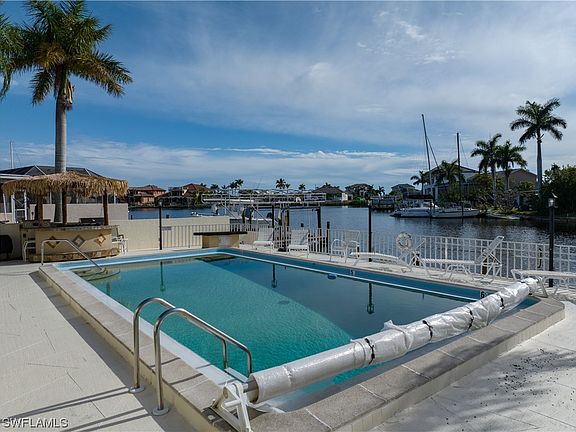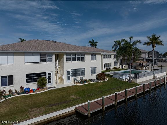 Amazing direct access location -seconds to River and right in heart of Downtown Cape Coral!! This 2 bed, 2 bath unit WITH PRIVATE GARAGE has been well loved through the years by this family as their winter escape and enjoyment. Second floor corner unit overlooking pool & basin! This condo offers 1200 sq ft living area-- front kitchen with brand new stainless steel appliances. Spacious living room/dining room as well as sun porch/Florida room. Nice size master with large walk in closet and private master bath. Ample size guest bedroom with nice guest bath. Also has inside laundry closet, large storage closet by dining area & hurricane shutters. Private detached garage is a rare find! AC (2019); hot water heater 2023. Unit is vintage condition -new buyer may want to update & make their own. Small pet friendly condo complex that is self managed. Beautiful pool with Tiki bar w/grill, fridge & tv. Boat slips are first come first serve - (currently would go on waiting list but soon may be available). Brand new roof. Complex does have full replacement cost for roofs & fema flood insurance. Wonderful location - walk to shops, restaurants and downtown activities! Easy to show...