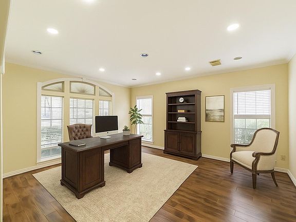 Oversized attached garageStunning front elevationFresh interior paintCustom built-insQuiet tree-lined streetCovered patioJetted tub