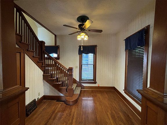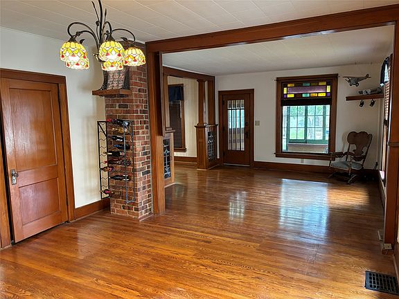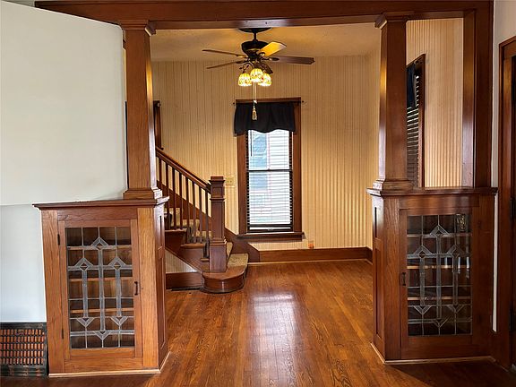 If you are looking for an older home with tons of character, look no further. This charming home has hard wood floors, original woodwork and build inns, beautiful staircase, and numerous stain glass windows. Upon entrance you are welcomed by an enclosed porch, (with porch swing) where you will be able to sit and watch the weather. On the main you have living/dining room with a kitchen that has beautiful cupboards, (appliances remain). Clever laundry area w/stack washer/dryer and extra cupboards. One bedroom on main as well as a full bath. Upstairs you will find 2nd & 3rd bedrooms, one is large enough to make a family room or use as master suite w/2nd bathroom. Outside you will find a side patio, carport, and oversized one car detach garage. Very unique feature is that there is also a house/shed that has served as a home office w/electric and window ac, perfect for someone who works from home and needs their own space. Location is walking distance to downtown and to the elementary schools. All information obtained from seller and public records.