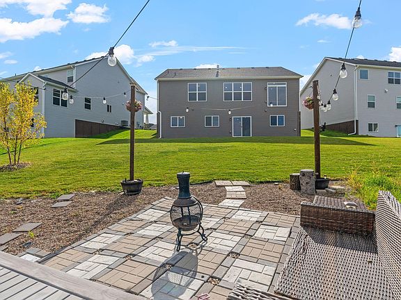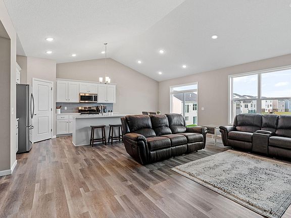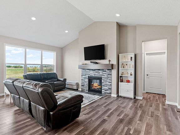 Stunning Like-New Rambler on Private Pond Lot. A beautifully designed 4-bedroom, 3-bathroom rambler offering a perfect blend of modern comfort and timeless design. Enjoy the spacious open-concept main living area with vaulted ceilings, a cozy fireplace, and large windows that bring in plenty of natural light. The kitchen features stone countertops, stainless steel appliances, a walk-in pantry, and a sizeable center island. French doors lead to a private office/den, perfect for extra space at home. The primary suite offers a serene retreat with a walk-in closet, double vanity, and private ensuite. A main-floor laundry room adds convenience, while the walkout lower level features a generous family room with a second cozy fireplace, abundant storage, and 2 additional bedrooms and full bath. Nestled on a private lot with serene pond views, enjoy the peaceful setting with a bonfire in the firepit area, green space for yard games and stunning nature views. The oversized 3-car garage provides plenty of space for vehicles and gear. This home is move-in ready and waiting for you!