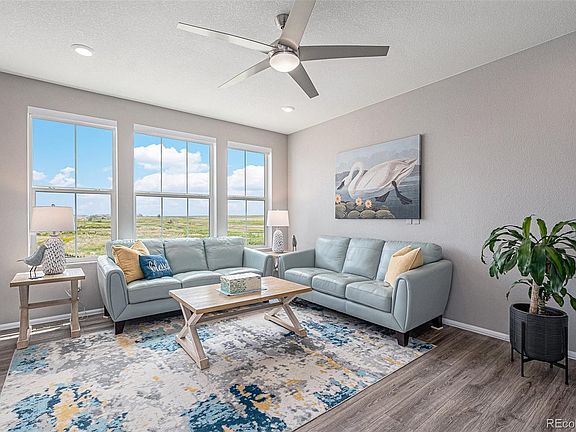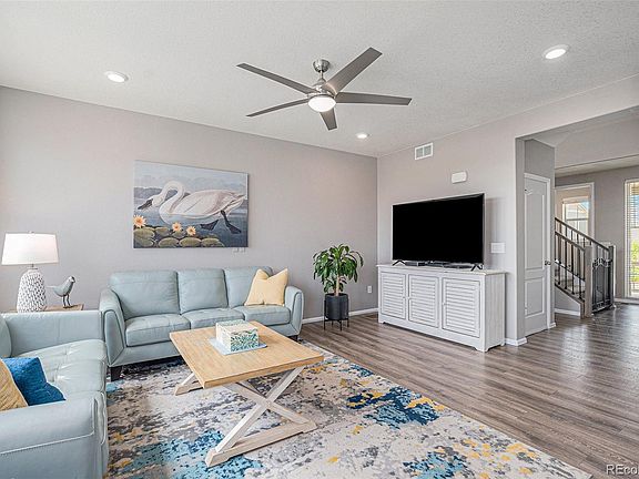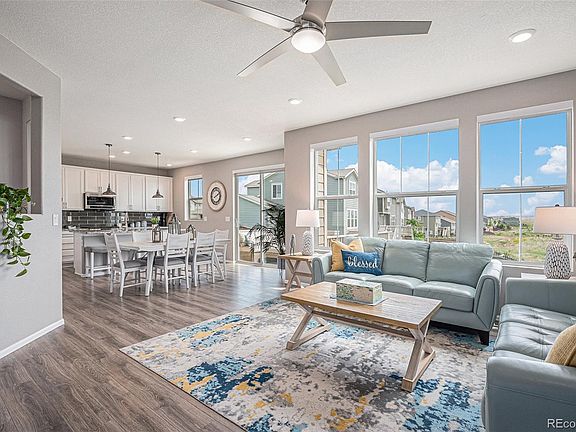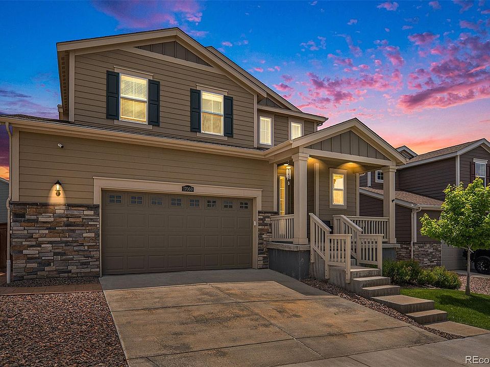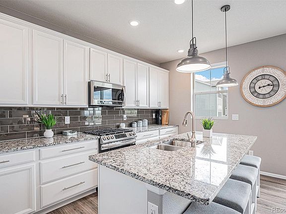 Welcome to this stunning two-story house offering an open, airy floor plan perfect for creating lifelong memories. Step through the foyer into a spacious living room filled with natural light. This inviting space flows seamlessly into the dining area and kitchen, ideal for family meals and entertaining guests. The dining area features a large sliding glass door opening to a raised balcony with unobstructed views of the Rocky Mountains and open space. The kitchen is a chef's dream with upgraded stainless steel appliances, granite countertops, and a kitchen island with eat-in bar seating. You'll love the ample storage provided by the beautiful cabinetry and the convenience of the adjacent pantry. The office nook with a built-in desk and granite countertop is perfect for working from home or managing projects. Upstairs, the primary bedroom features a recessed ceiling, adding a touch of elegance. The en-suite bath includes a walk-in shower and a spacious walk-in closet. Two additional bedrooms share a full bath with dual sinks, providing plenty of space for family or guests. The finished garden-level basement is a standout feature, offering a versatile great room that could serve as a mother-in-law suite or guest area. With large windows, the space is filled with natural light, creating a warm and inviting atmosphere. It includes a mini kitchen and a full bathroom with a walk-in shower, ensuring comfort and privacy. Additionally, the extended garage provides ample room for extra storage or a workshop, catering to all your needs for space and functionality. Location is key, and this home does not disappoint. Just half a block to the west, the soon-to-be-completed Oasis Park will offer a community lawn and plaza, playground, educational and feature garden, viewing deck, and an embankment slide. Plus, new high school and elementary schools are planned nearby, making this an ideal spot for families. Don't miss out on the opportunity to make this house your home!