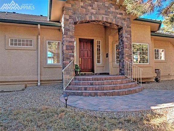 Breathtaking Bent Tree walk out ranch w/ spectacular Pikes Peak views is located at the end of private cul-de-sac on 2.8 treed acres, Enjoy outdoor living on the trex deck or 950 sq ft paved-stone patio complete with custom wood fireplace in private courtyard, Spacious 3 car garage w/ 20 ft ceilings, workshop, 1/2 bath, & custom 4 bike storage area as well separate staircase leading down to the walk out basement complete with cellar trap door for extra wine or food storage underground. Detached over size two car garage is