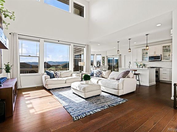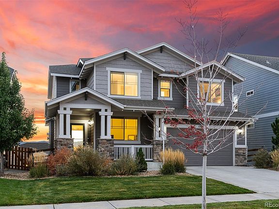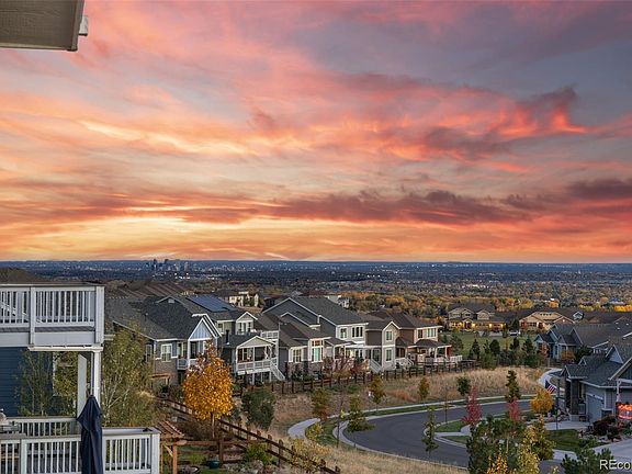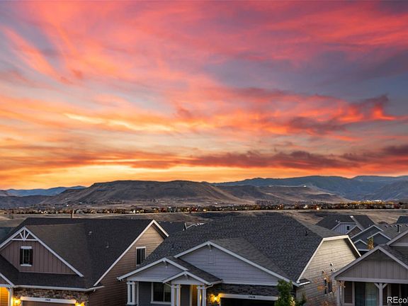 Imagine a home that has massive views and is the perfect size inside! This is that home. This two-story home located near the east entrance of Leyden Rock boasts AMAZING CITY & MOUNTAIN VIEWS and has a comfortable floor plan with the perfect amount of space plus room to grow in the unfinished walkout basement. When entering this fine home, you will be immediately captivated by the dark wood floors and convenient study off the front door. Further back discover tall windows & an open design with a gourmet kitchen complete with creamy white cabinets, stainless appliances & lots of granite counters. There is also an enormous walk-in pantry!! The dining room is ample sized for entertaining on a quaint or grand scale & has access to two decks on either side. The great room features an 18-foot stacked stone fireplace and lots of room to sit and visit or watch your favorite show. Upstairs you will notice the contemporary stair railing and will enter into a small loft that would be perfect for a second office, homework or play area. The primary suite is spacious and features those amazing views with a private deck perfect for viewing stunning sunsets behind the mountains as well as enjoying the city lights to the east! A beautiful 5-piece ensuite bath off the primary bedroom with a nice sized closet. There are two ample sized secondary bedrooms that share a bath with closed off door to the shower/water closet making it an easy situation for sharing the bathroom. The upper-level laundry room is perfectly located and has great workspace. The walkout basement is awaiting your finishing touches and pours out to the back yard that has a beautiful patio with fire pit and a fully fenced yard. Backing to a greenbelt & then a quiet road there is a lot of privacy and no real neighbors behind this home. Walk to beautiful Daybreak park. Feeds into excellent rated schools & easy access to Denver & Boulder. Welcome HOME!