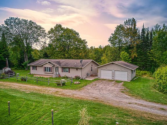 Newer country home located east of Rhinelander providing 80 acres of nicely wooded privacy. The main level of this spacious home offers an open concept kitchen, dining and living room area, large master suite, office, 2 additional bedrooms and a full bath. The finished walk-out lower level features a family room, bonus room, half bath, laundry, workshop area and plenty of storage space. Outside you will appreciate the 24 x 24 garage, expansive backyard deck and landscaped yard. This property also offers a 30 x 48 pole building with power and a 12 x 22 garage for additional storage. The acreage is primarily high ground with some wetlands and a small pond near the home. Property is zoned General Use.