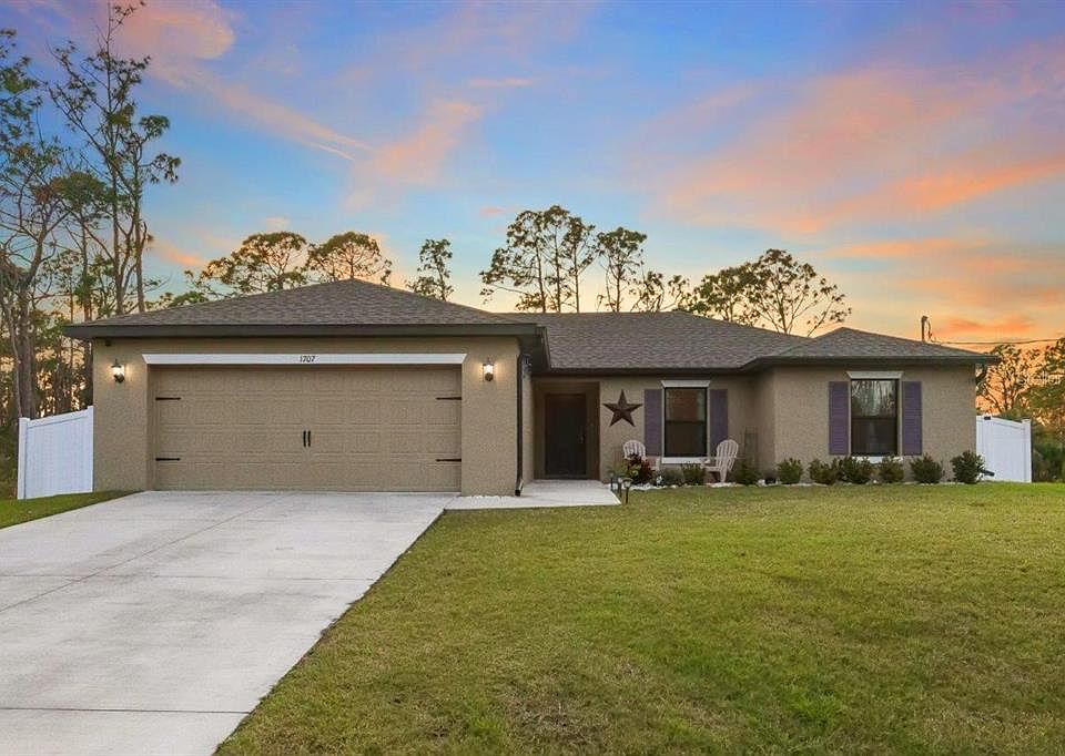 This newer 2020 LGI home is the epitome of comfort and style. From the moment you arrive you’ll notice the oversized lot, mature landscaping, and the natural surroundings creating a warm peaceful atmosphere. As you step in, you’ll notice the open Brickell II floorplan features 18” tile, 10’ cathedral ceilings throughout providing plenty of space for relaxation and entertaining. The spacious kitchen features newer appliances, a large island with a breakfast bar, and granite countertops. The great room features a large sliding glass door bringing in ample amounts of natural light, while providing views of the covered patio and fenced-in back yard. The owner’s suite comes with a large walk-in closet, ensuite bathroom with a spacious walk-in shower. The split floor plan is perfect for guests, providing them with a semi-private bathroom and bedrooms. This home also boasts a fourth bedroom, perfect for a personal gym or office! Another bonus this home offers is no HOA and CDD fees! The city of North Port is an up-and-coming family-friendly development offering tons of parks, outdoor facilities, recreational opportunities, events calendar, blueways for water activities, and so much more. It has a central location with easy access to major surrounding cities like Port Charlotte, Punta Gorda, and Venice. Is this home your perfect match? Schedule a showing today!