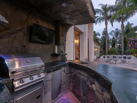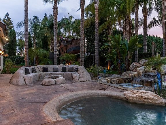 Luxury Family Haven in Seven Oaks, Grand Island. Discover your dream home - a sprawling 4,357 sq. ft., 4-bedroom, 3.5-bathroom masterpiece. This two-story estate exudes unmatched curb appeal, boasting a freshly updated exterior with a stunning design, elegant entry, and top-of-the-line lighting. The grand circular driveway is framed by beautiful palms and fountain, welcoming you into this extraordinary property. Step inside and be greeted by a majestic foyer featuring a crystal chandelier and fireplace. The sophisticated library, with its exquisite wood paneling, opens to a private home theater. High ceilings and elegant finishes complement the open, gourmet chef's kitchen with all-new appliances. In the breathtaking master suite offers a two-way fireplace, jumbo jacuzzi tub, rainfall shower, and a custom walk-in closet. Private outdoor oasis enjoy a designer pool and spa retreat with attached hot tub, and serene waterfall pond flow into a rock-walled outdoor bar and BBQ area.
