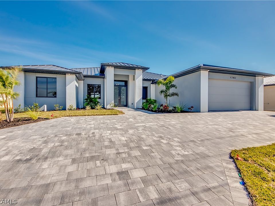 Gorgeous, contemporary, NEW CONSTRUCTION, WATERFRONT HOME, with a standing seam metal roof and all the bells and whistles! Stunning glass, double door entry opens up to a spacious family room, 3BR+den/3ba, 2193sf of living area with oversized tile floors throughout. Gorgeous kitchen with stainless steel appliances which include a hood over the oven and a built-in microwave, plenty of cabinets with double drawers, countertop space and a large waterfall island. The family room has quadruple sliders that open up to the expansive 40 foot lanai with outdoor kitchen hook-up and complete with sundeck. The master bedroom has a transom window allowing for more wall space, his and her closets as well as sliders to the lanai, and the master bath has dual sinks with a freestanding tub and large shower while one of the guest baths doubles as a pool bath. Splash away in the pool with a sun shelf and bubblers, or enjoy entertaining on the lanai with the relaxing water views through the picture frame pool cage. A must see!