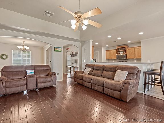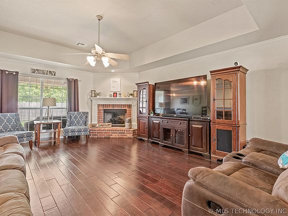 WELCOME HOME: one owner, well maintained home is located in the desirable Churchill Park & Jenks West Schools. Beautiful curb appeal, established landscaping, covered front porch welcomes you into this open floor plan, living room with a brick fireplace, large kitchen, a large nook, pantry and abundance of counter space. Large primary suite/ bath with double sinks, separate shower, tub and his and her closets, Off the kitchen awaits your outdoor living space made to relax or entertain on the large covered patio. UPDATES include: New roof in 2020, New A/C 2018, exterior paint 2020, engineered hardwood floors in living room and hallways, concrete extended on driveway, outside back patio and sidewalk along side of the house in 2019. Easy access to Hwy 75, Creek Turnpike, Tulsa Hills for all your shopping, dining needs, grocery stores & minutes to the Ten District in Historic Jenks, OK