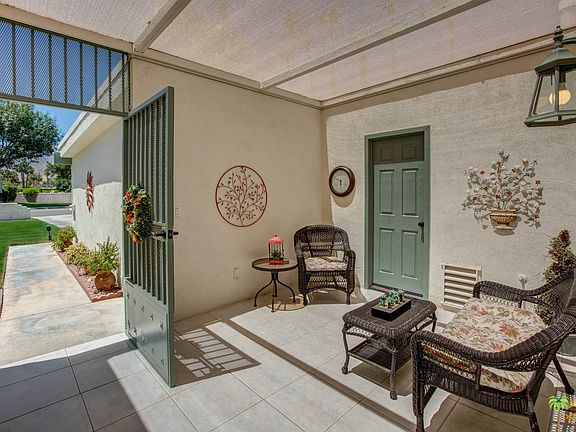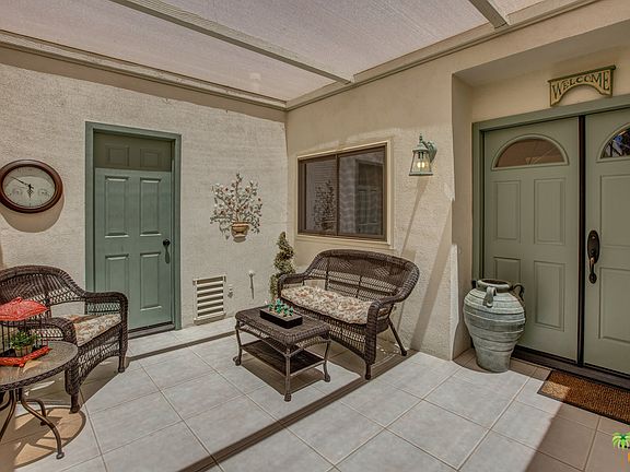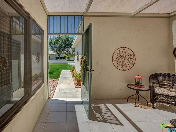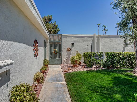 Pride of ownership shows in this impeccably maintained 2 bed, 2 bath condo in Sunrise Villas, on land you own! Enjoy morning coffee on the spacious tiled front lanai and unwind in the evening on the large tiled back patio with greenbelt and pool views. Updated kitchen with granite counters, glass tile back splash, refaced cabinets, recessed lighting, and newer appliances. There is matching tile flooring throughout, new dual pane windows and sliders, and custom window coverings. Newer HVAC, water heater and French door entry. There is an attached 1 car garage with room for storage. Sunrise Villas has acres and acres of green space, 8 pools, 3 spas, tennis and pickle ball courts and mountain views. Great Palm Springs south end location, close to shopping, restaurants, hiking and just a short drive or bike ride to downtown Palm Springs.