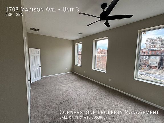 Introducing our 2 Bed 2 Bath and Office apartment located in the heart of Baltimore, MD. This spacious unit features central HVAC to keep you comfortable year-round. The kitchen comes equipped with essential appliances including a refrigerator and gas stove, perfect for preparing meals at home. With the convenience of a washer/dryer in-unit, laundry day just got easier. Enjoy the ease of easy access street parking, making coming and going a breeze. Don't miss out on this fantastic opportunity to call 1708 Madison home! -Large kitchen w/ updated appliances and lots of cabinet space Utilities - Water: There is one Baltimore City water bill for the entire building, therefore you are not required to put the water bill in your name. You will be charged a flat monthly rate for water - it will be $50 per person per month & it will be charged to your ledger each month. Pet Policy: Case by Case Parking: Street Utilities: Covered by Resident Income Requirement: $3250 Credit Score: 650 or higher $75 Move-In Fee All Cornerstone Property Management residents are enrolled in the Resident Benefits Package (RBP) for $40.95/month which includes renters insurance, HVAC air filter delivery (for applicable properties), credit building to help boost your credit score with timely rent payments, $1M Identity Protection, move-in concierge service making utility connection and home service setup a breeze during your move-in, our best-in-class resident rewards program, and much more! More details upon application.* Appliances Refrigerator Central Hvac Easy Access Street Parking Gas Stove Washer/Dryer
