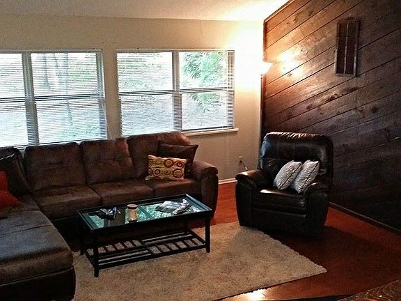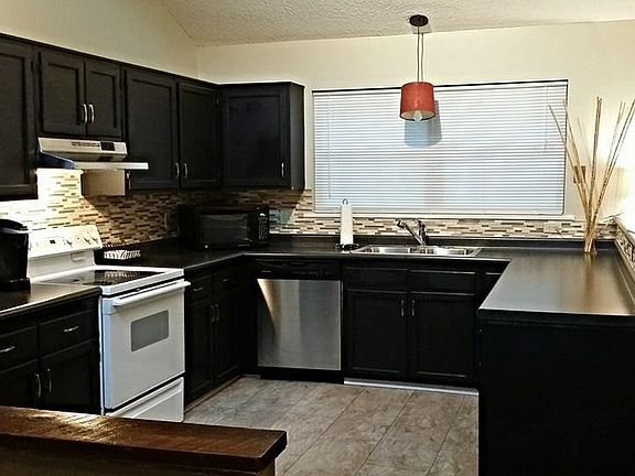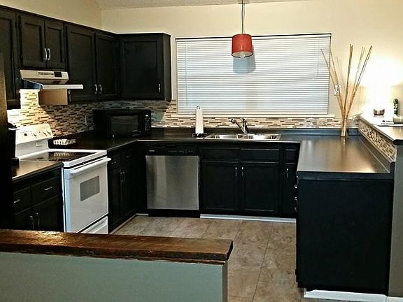 Adorable 3 bedroom 2 bath home situated in a quiet cove priced below appraisal! Living room has wood floors, a wood planked wall and fireplace and vaulted ceiling. Kitchen has black cabinets with breakfast bar and back splash. Main rooms have a skylight to let in natural light. Bedroom are all good sized with new carpet. Master bath has a tiled walk in shower. Modern fixtures and mirrors throughout.