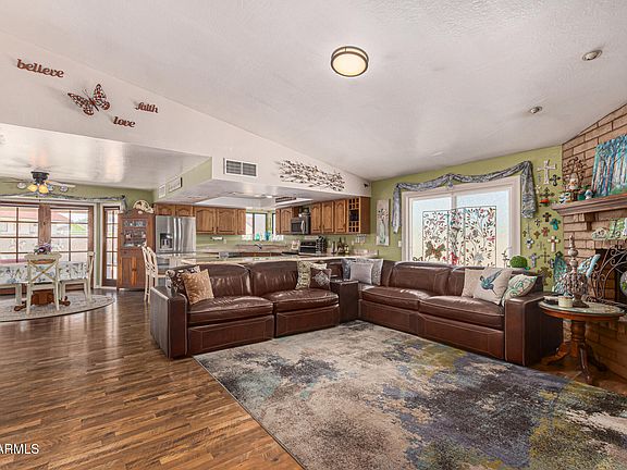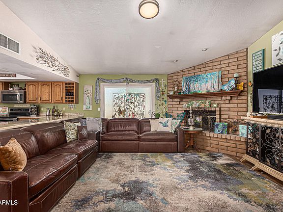 This custom 3-bedroom, 2-bath home with a den is ideally located at the end of a peaceful cul-de-sac, providing extra privacy and a serene atmosphere. The spacious kitchen is a chef's dream, featuring ample counter space, a peninsula, a kitchen island, and plenty of cabinet storage, all opening into the inviting family room with a cozy fireplace - perfect for relaxing or entertaining. The lovely backyard is an entertainer's paradise, boasting a sparkling pool, low-maintenance turf, and abundant space for all your outdoor activities. Enjoy warm Arizona evenings on the covered back patio, perfect for dining or unwinding. Inside, you'll find high-quality finishes like stainless steel appliances, sleek granite countertops, and a tankless water heater for energy-efficient hot water. The home also includes practical features like an RV gate, offering plenty of space and flexibility. Best of all, there is no HOA, giving you the freedom to make this home truly your own.