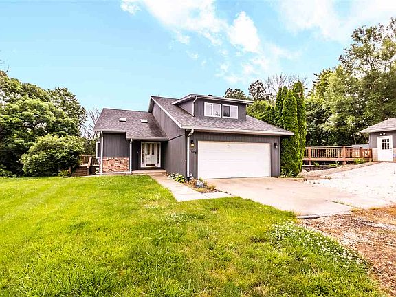 PRIVATE SETTING! You will love the wooded views this 4 BR 3 BA home on 4.64 acres has to offer. Large Deck on back. Attached 2 car garage + detached 2.5 car garage. Main floor Laundry. Master BR is 31x15 w/ massive Ikea closet area & Full MBA. Walk Out Finished Basement has 20x16 Family Rm w/ beverage center & 18x14 Rec Rm. Main floor has 29x15 Living Rm w/ hdwd flr & Vaulted ceiling. Updated Eat in Kitchen 19x13 w/ hdwd flr, Corian countertops, & wood burning Fireplace. Come take a look today!